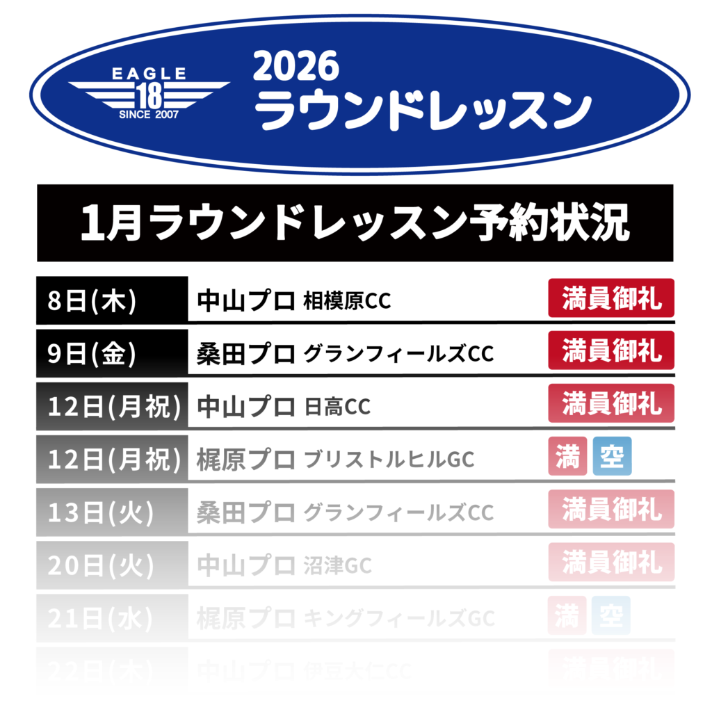 グループレッスンクラス開講!! クォーター理論を体験!!初心者をはじめ90や100切りを目指しているアベレージゴルファーにリーズナブルなレッスンを弊社プロが提供いたします。 詳しくはこちら → プロアマスクランブルラウンドコンペ Pro Amateur Round Competition 年間10戦。1組に1人プロが入り、ティーショットを全員で打ち最良のボールを選択し、そこから2打目以降も全員で打ち、チームでスコアメイクをしていきます。 詳しくはこちら → 壁切りラウンドレッスン 「KABEKIRI」Round Lesson スコア100や90、80などレベルに合わせ、目標を設定し壁を破るために必要なことをレッスンや練習で身に付け、これを毎月いろいろなタイプのコースで試すラウンドレッスン。。 詳しくはこちら → オンライン ショップ ONLONE SHOP オリジナルグッズ、書籍、DVD、クラブ、練習道具を取り揃えております。 詳しくはこちら → 企業理念・信 念 Corporate PhilosophyBelief 詳しくはこちら PGAティーチングアワード Teaching Award excellence 詳しくはこちら クォーター理論 Quarter Theory 詳しくはこちら レッスン Lesson 詳しくはこちら 施設案内 Factory Information 詳しくはこちら プロの紹介 Pro 詳しくはこちら お知らせ お知らせ一覧 2026年2月レッスン予定を更新しました2026年1月10日 2026年1月レッスン予定を更新しました2025年12月10日 練習場のボールが新しくなりました2025年5月2日 登録料導入のお知らせ2025年2月4日 BSフジ放送のご案内2025年1月13日 ▶︎【重要】迷惑メール(なりすましメール)に関するお詫びと注意喚起 レッスン受付中 受付中レッスン一覧 桑田プロ・中山プロといく静岡キャンプ 2026年2月16日~17日 桑田プロ・中山プロといく鹿児島キャンプ 2026年3月2日~4日 桑田プロ・照喜名プロ 祝日限定☆スペシャルレッスン 2026年2月11日(水祝)・2月23日(月祝) タイムレッスン 2026年2月 タイムレッスン 2026年1月 プロアマスクランブルコンペ Pro・Amateur Scramble Compe 壁切りレッスン 「KABEKIRI」Lesson オンラインショップ Online Shop 2026年イベントレッスン \お申し込み受付中!!/ 営業時間Open 会社概要・アクセスCompany・Access 介護スポーツデイサービスOnline Shop メディア・講演Media・Lecture 動画配信Video Lesson 求人Job Information 所在地東京都町田市南町田5丁目11−16 電車でお越しの場合東急田園都市線「南町田駅」駅下車 徒歩1分 営業時間火・金 18:00~22:00水・木 10:00〜22:00土 9:00〜20:00日 9:00〜18:00※年末年始等変更あり 042-705-7018ご来社の場合はお電話でお問い合わせください