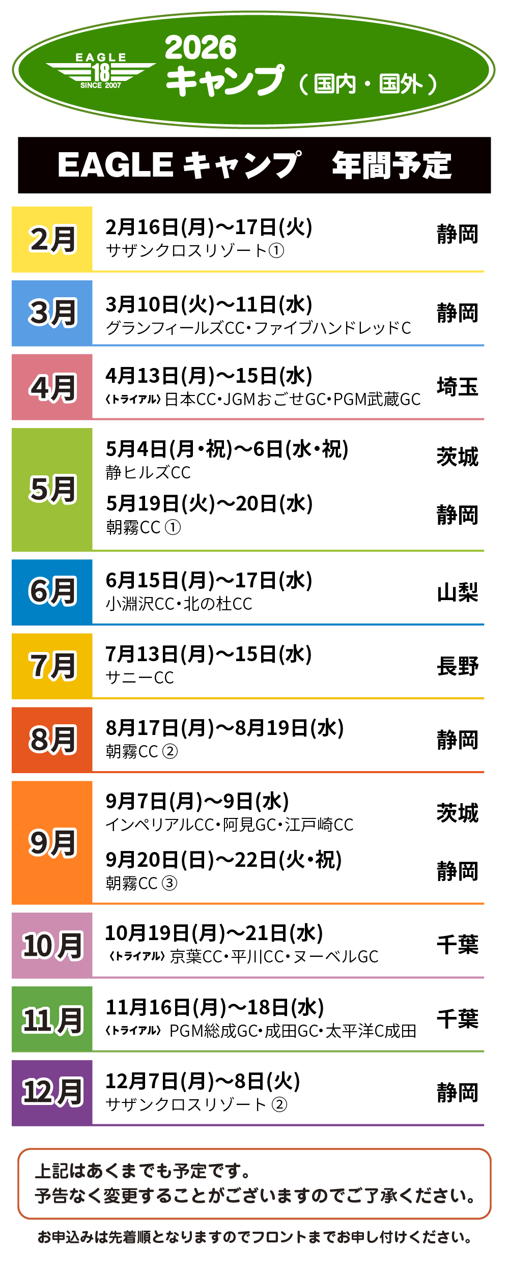 - 上記参加費には、レッスン代、プロのプレー代等諸経費代が含まれております。(ボール代別途)