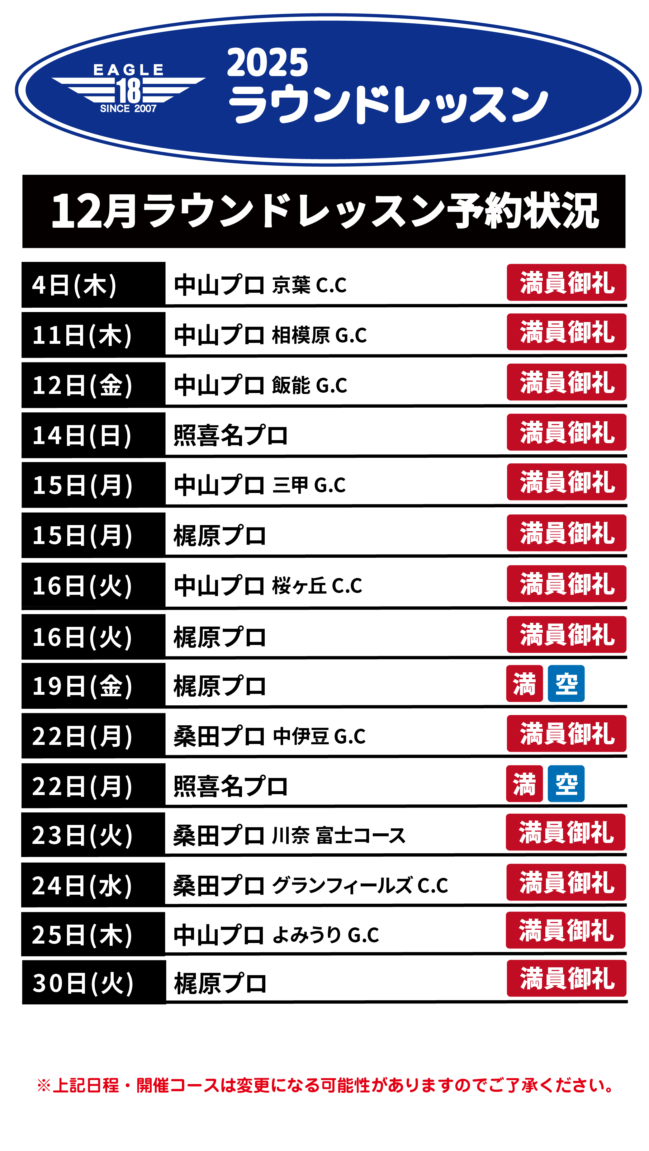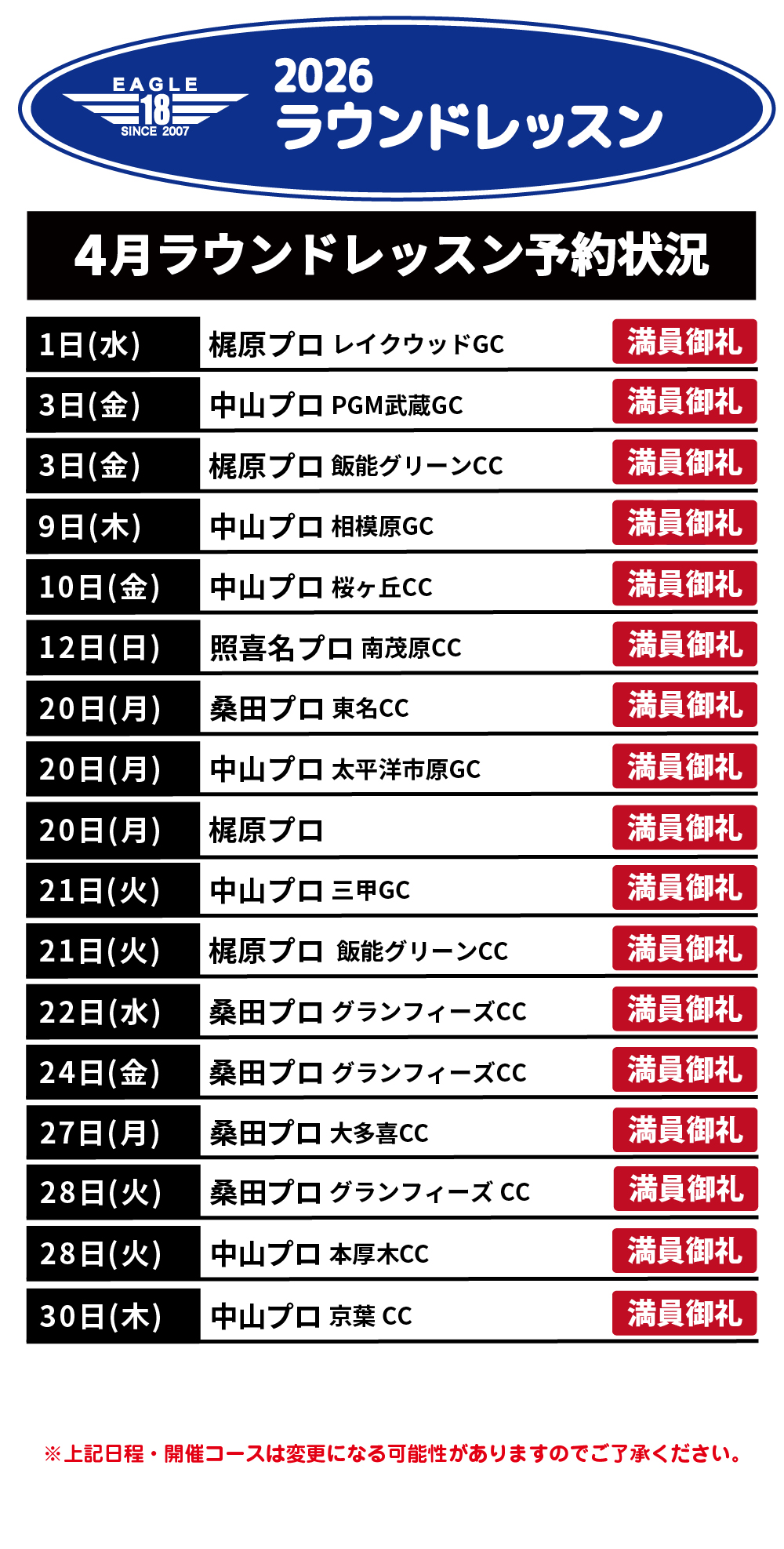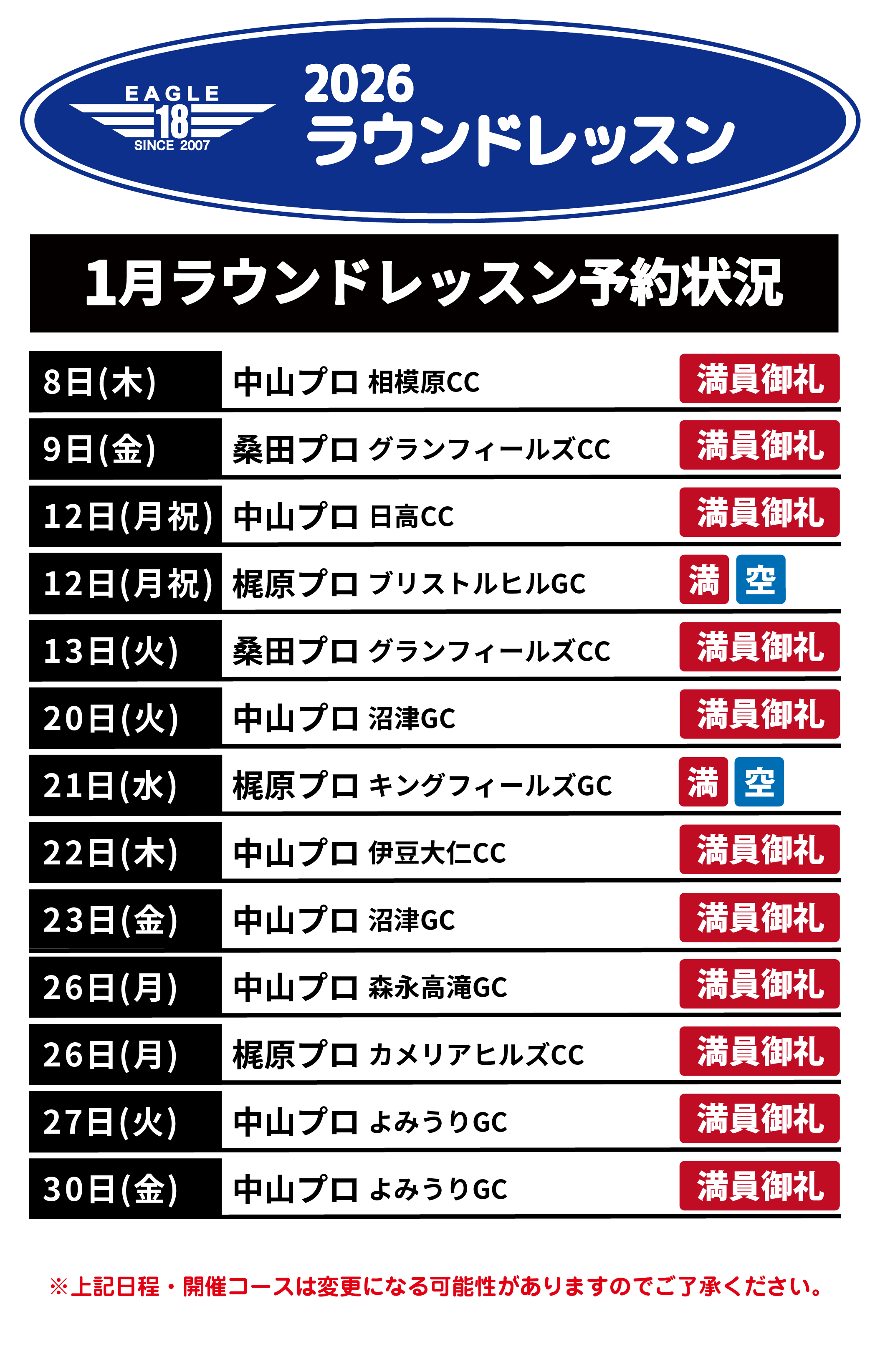 ※上記料金はレッスン代のみの料金となりますのでプロのプレーフィー、食事代は別途お客様にご負担いただきます様お願い致します。